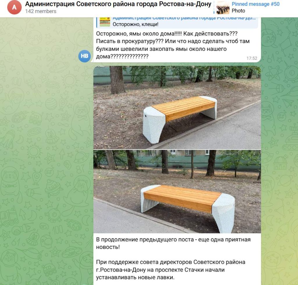 Похожая ситуация происходит и в других районах Ростова-на-Дону. Главы районов и другие чиновники находятся в президиуме, отчитываются о проделанной работе и вручают награды. А Советы директоров активно помогают району. Особенно активным, наряду с Ленинским, стал Советский район. Там администрация отчитывается об установке по инициативе местного Совета лавочек на проспектах Стачки и Коммунистическом. В других районах работу Советов также освещают регулярно.
