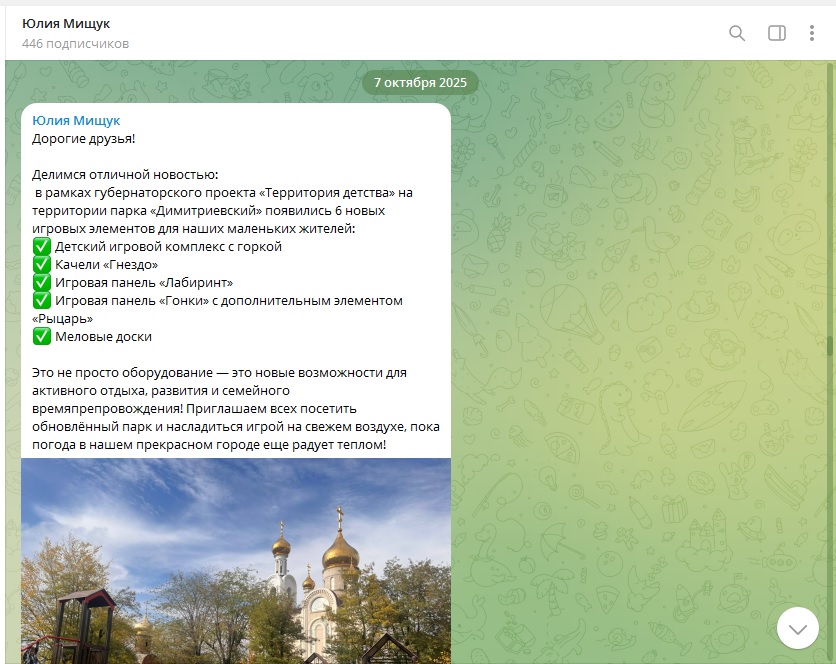«Это не просто оборудование — это новые возможности для активного отдыха, развития и семейного времяпрепровождения! Приглашаем всех посетить обновлённый парк и насладиться игрой на свежем воздухе, пока погода в нашем прекрасном городе еще радует теплом!», — написала тогда глава администрации.